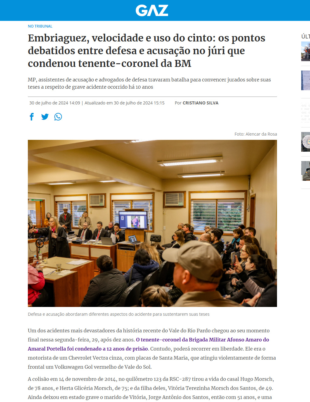 Um dos acidentes mais devastadores da história recente do Vale do Rio Pardo chegou ao seu momento final nessa segunda-feira, 29, após dez anos. O tenente-coronel da Brigada Militar Afonso Amaro do Amaral Portella foi condenado a 12 anos de prisão. Contudo, poderá recorrer em liberdade. Ele era o motorista de um Chevrolet Vectra cinza, com placas de Santa Maria, que atingiu violentamente de forma frontal um Volkswagen Gol vermelho de Vale do Sol.